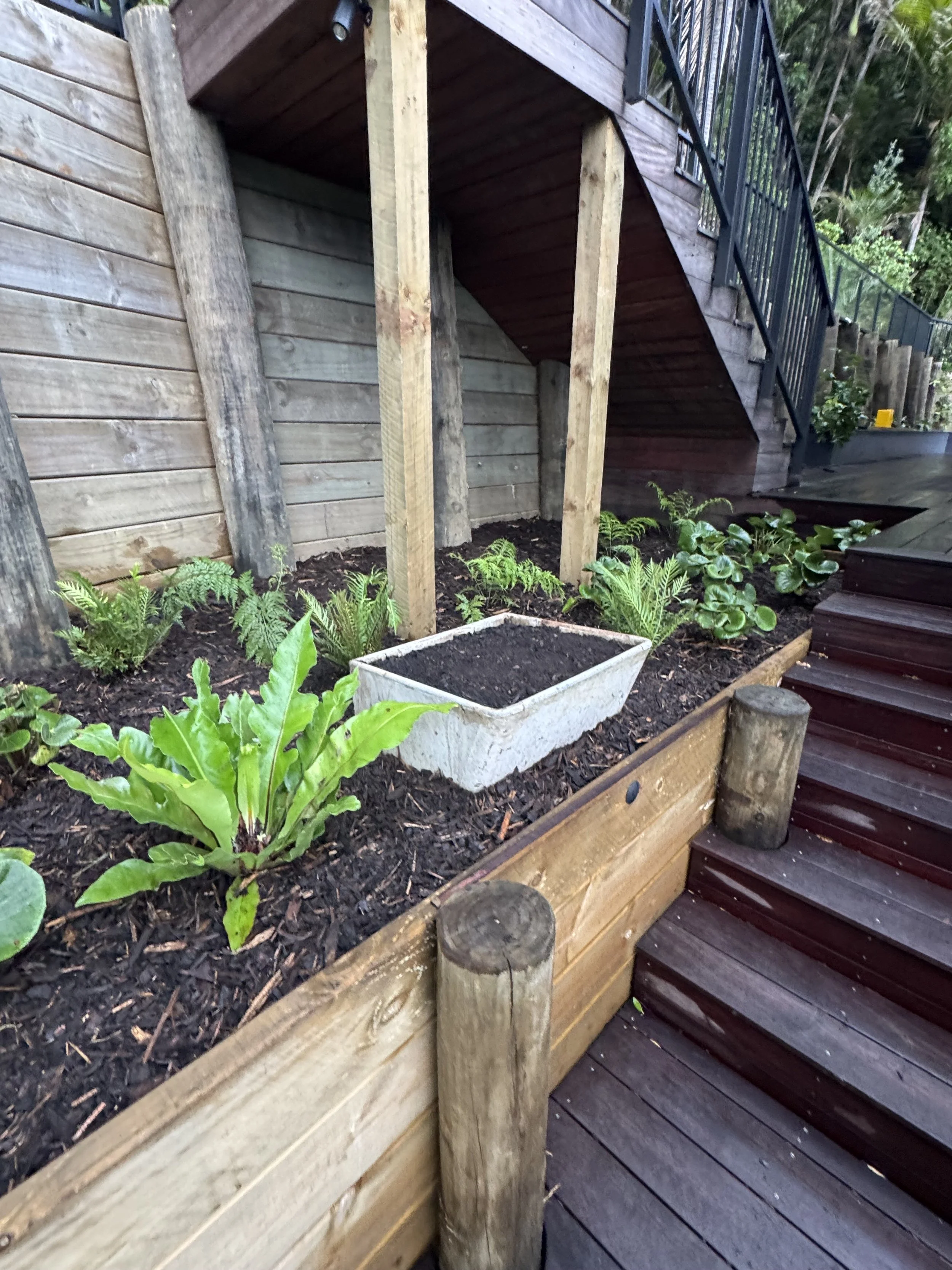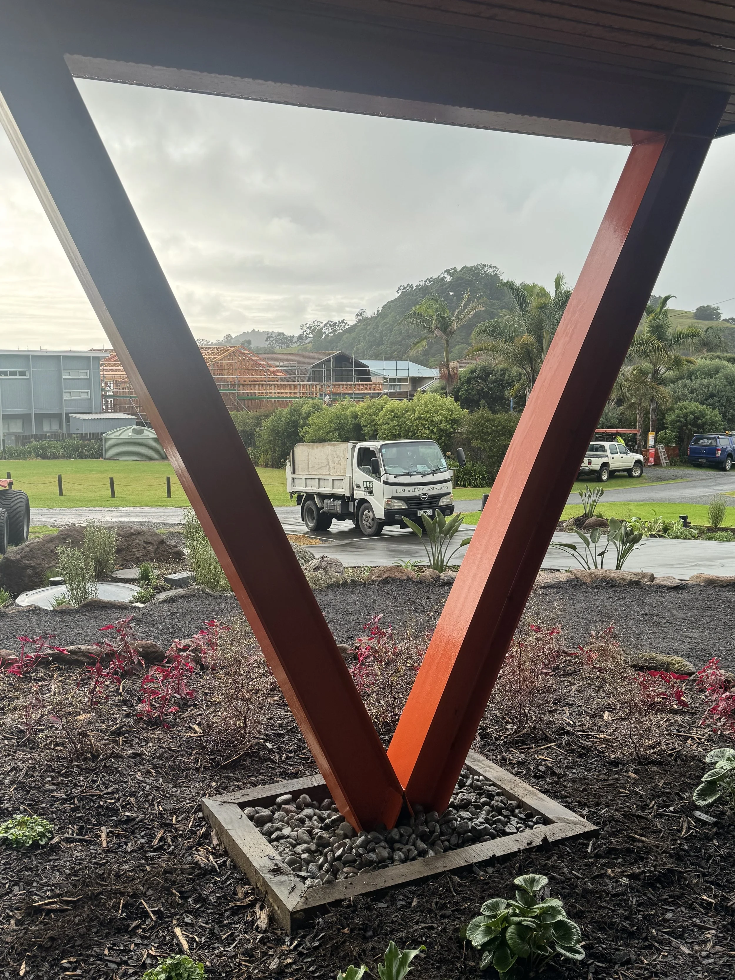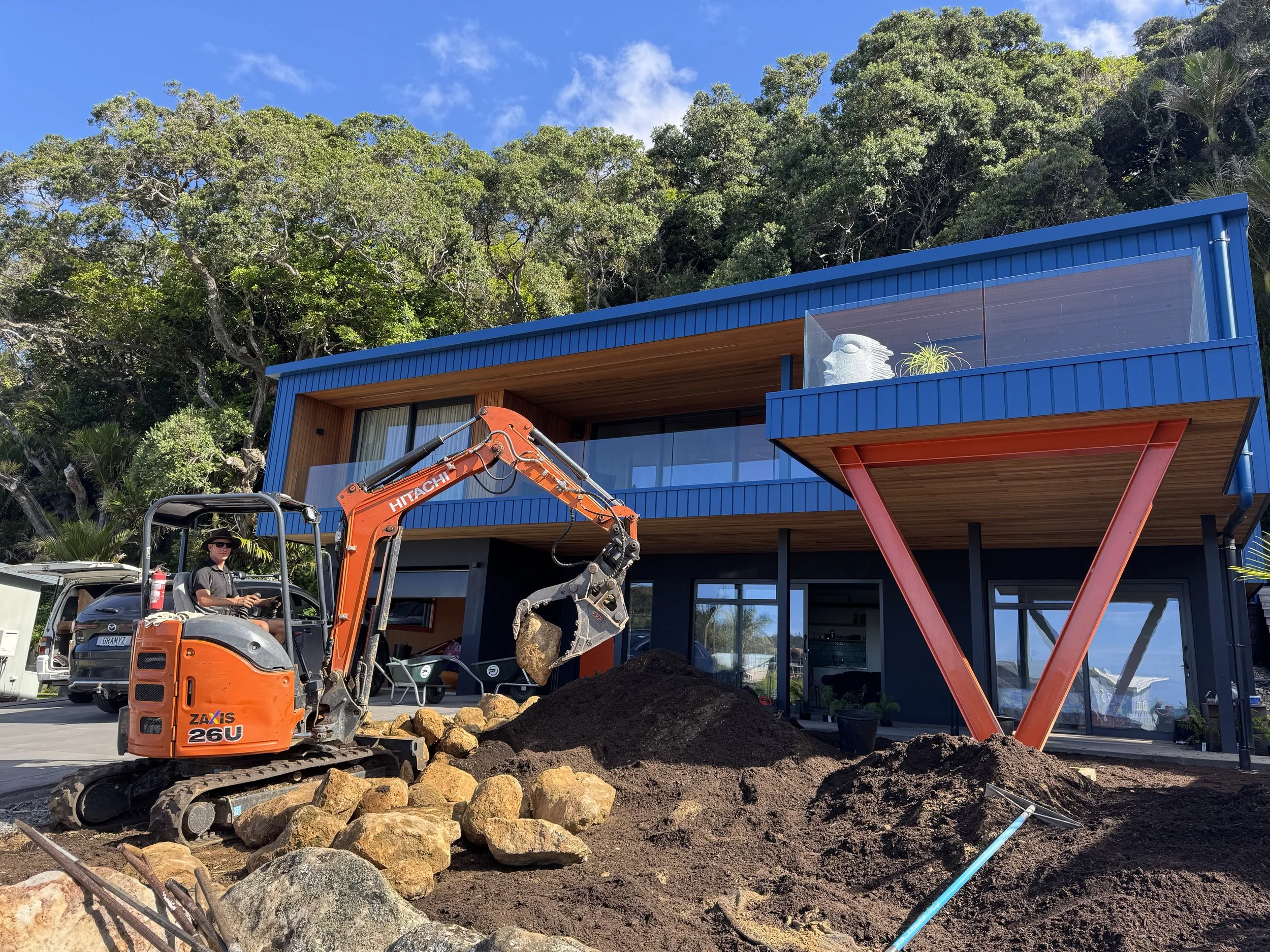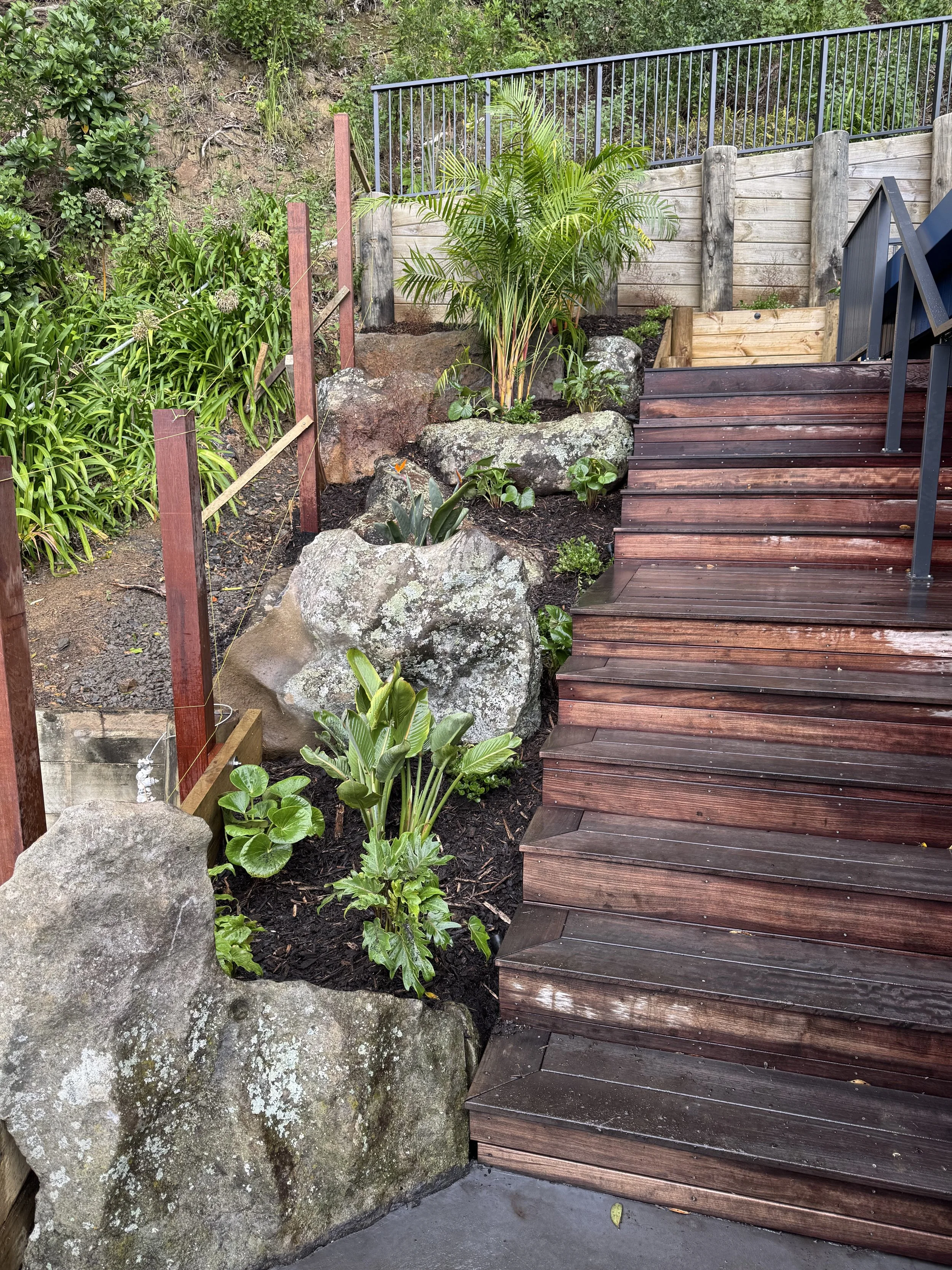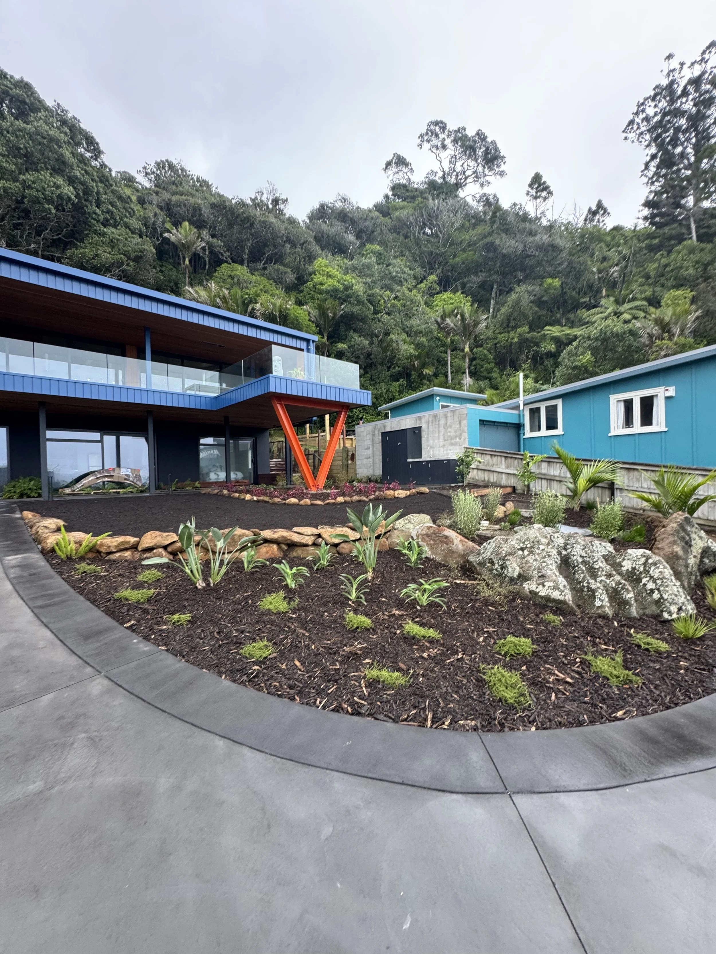 Tucked away between stands of Puriri and Nikau, this secluded coastal retreat captures the essence of lush, natural beauty. The landscape design blends tropical planting with bold feature rocks, creating a vibrant, textural contrast that feels both refined and effortless. Every element — from the sculptural stonework to the layered foliage — enhances the sense of privacy and connection to the surrounding coastal forest. The result is a tranquil haven that celebrates the rugged elegance of Helena Bay’s environment.