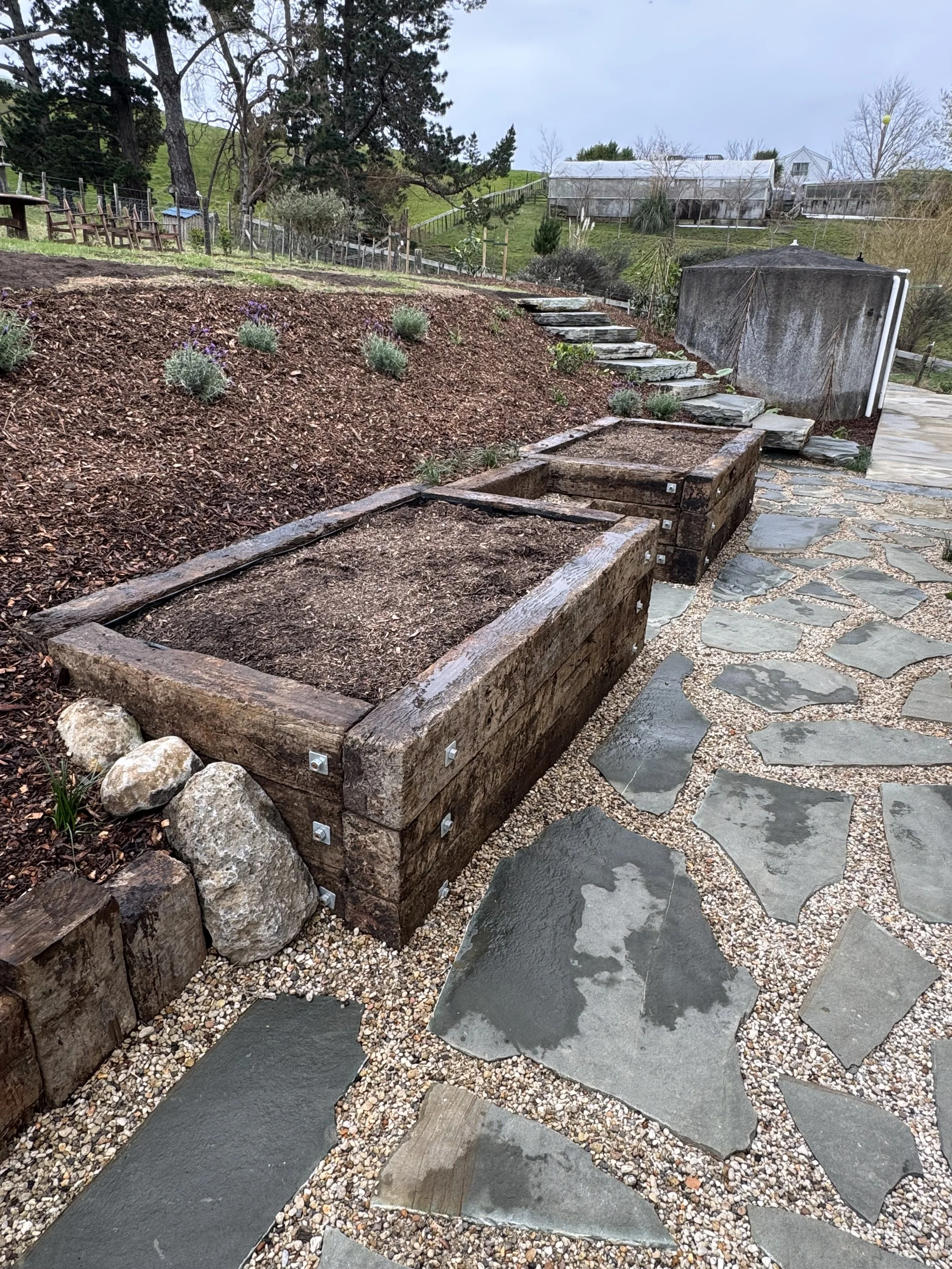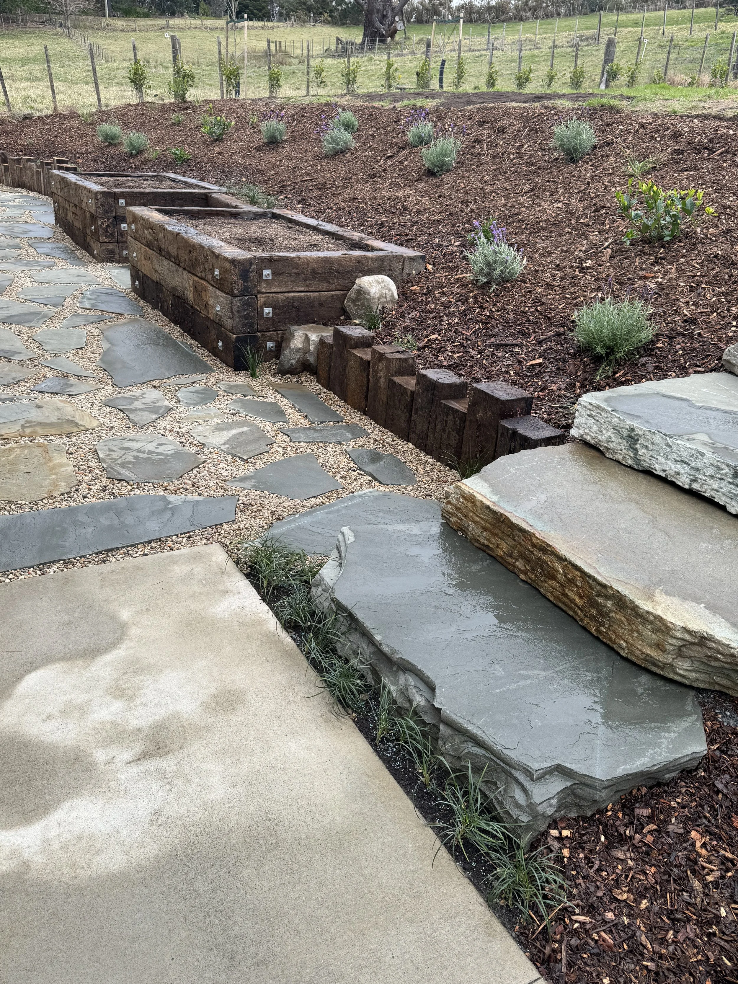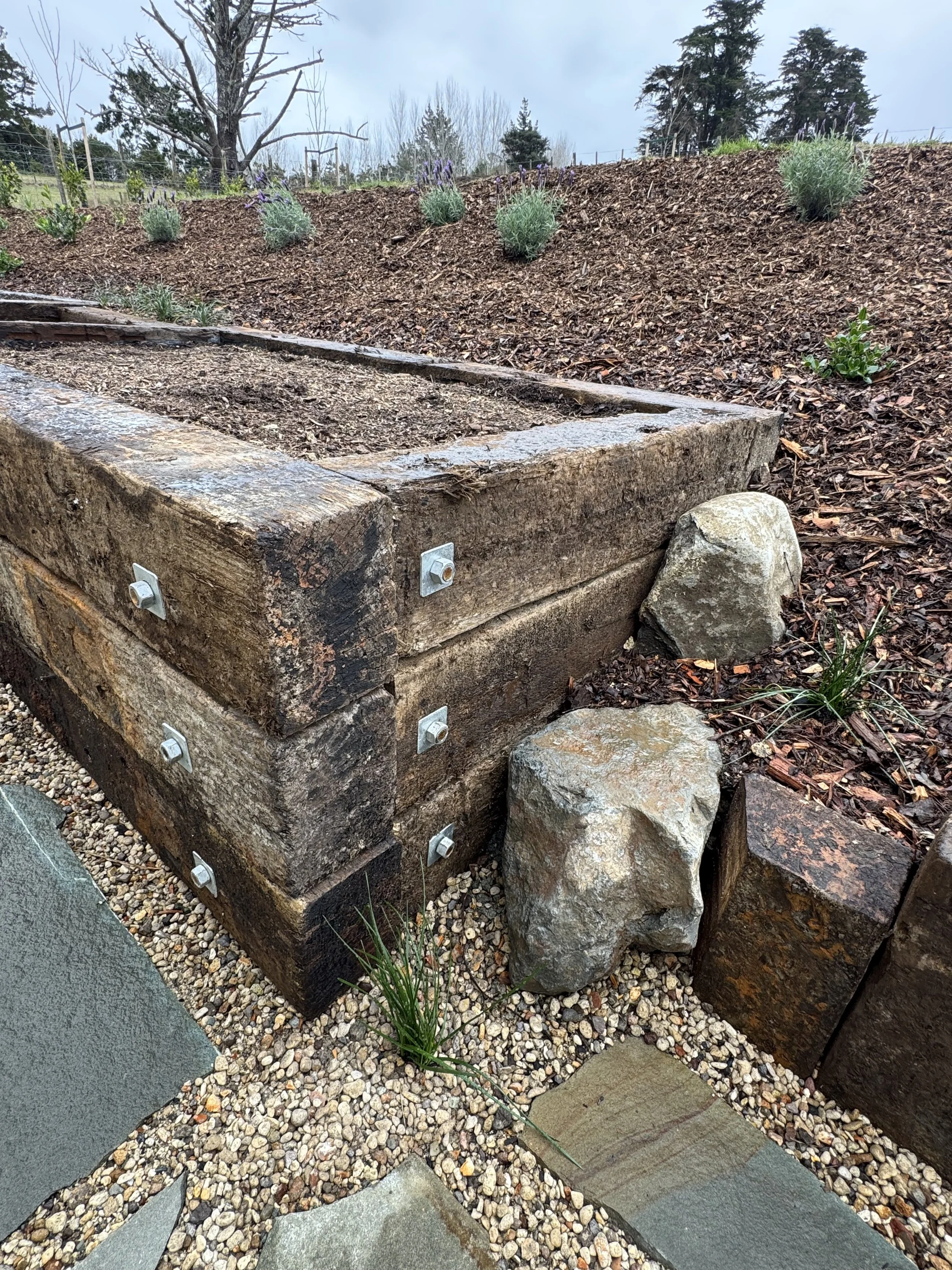 Rustic used railway sleepers form robust raised planters and retaining edges, softened by mulched garden beds planted with lavender, lancewood, and herbs. Natural boulders are nestled throughout, grounding the design and adding a sculptural element.