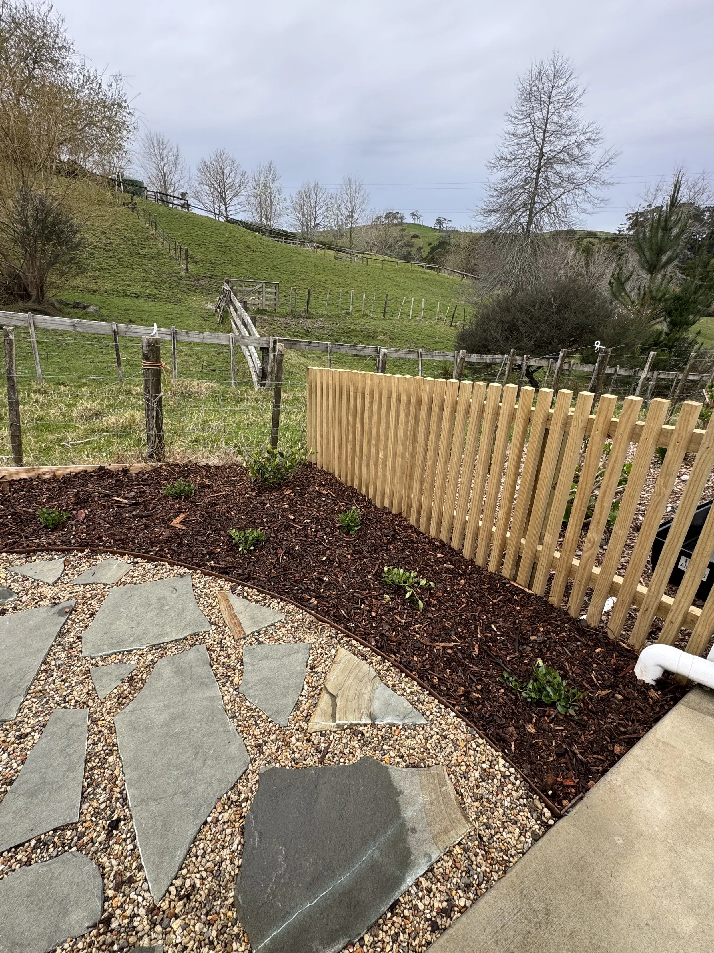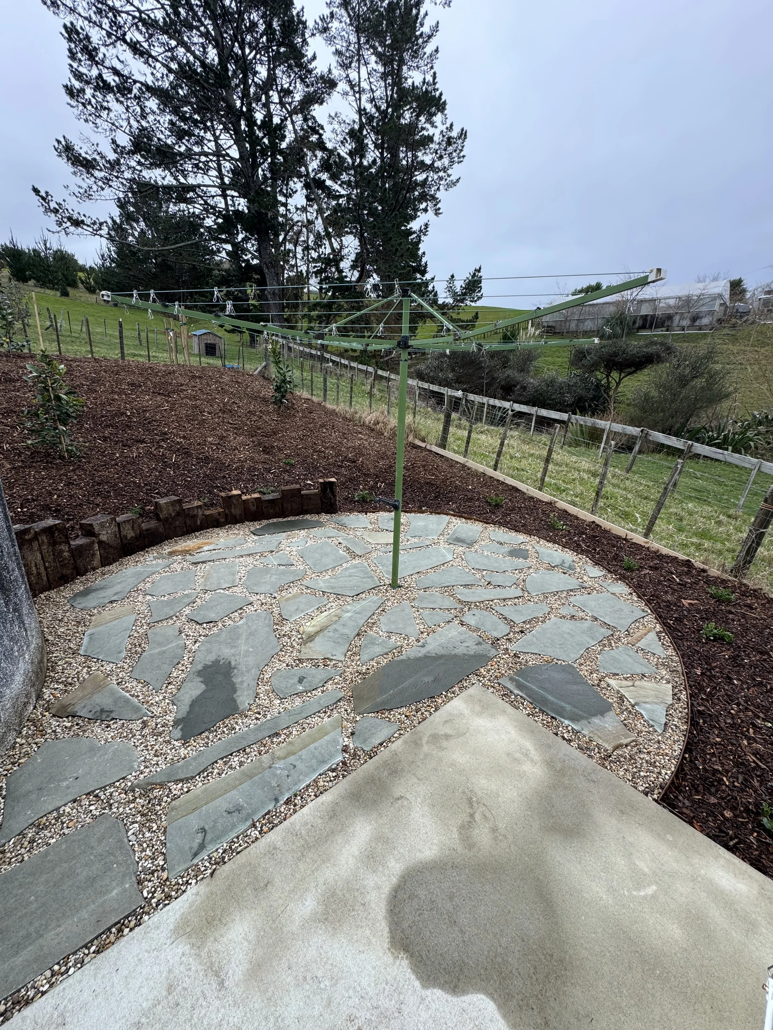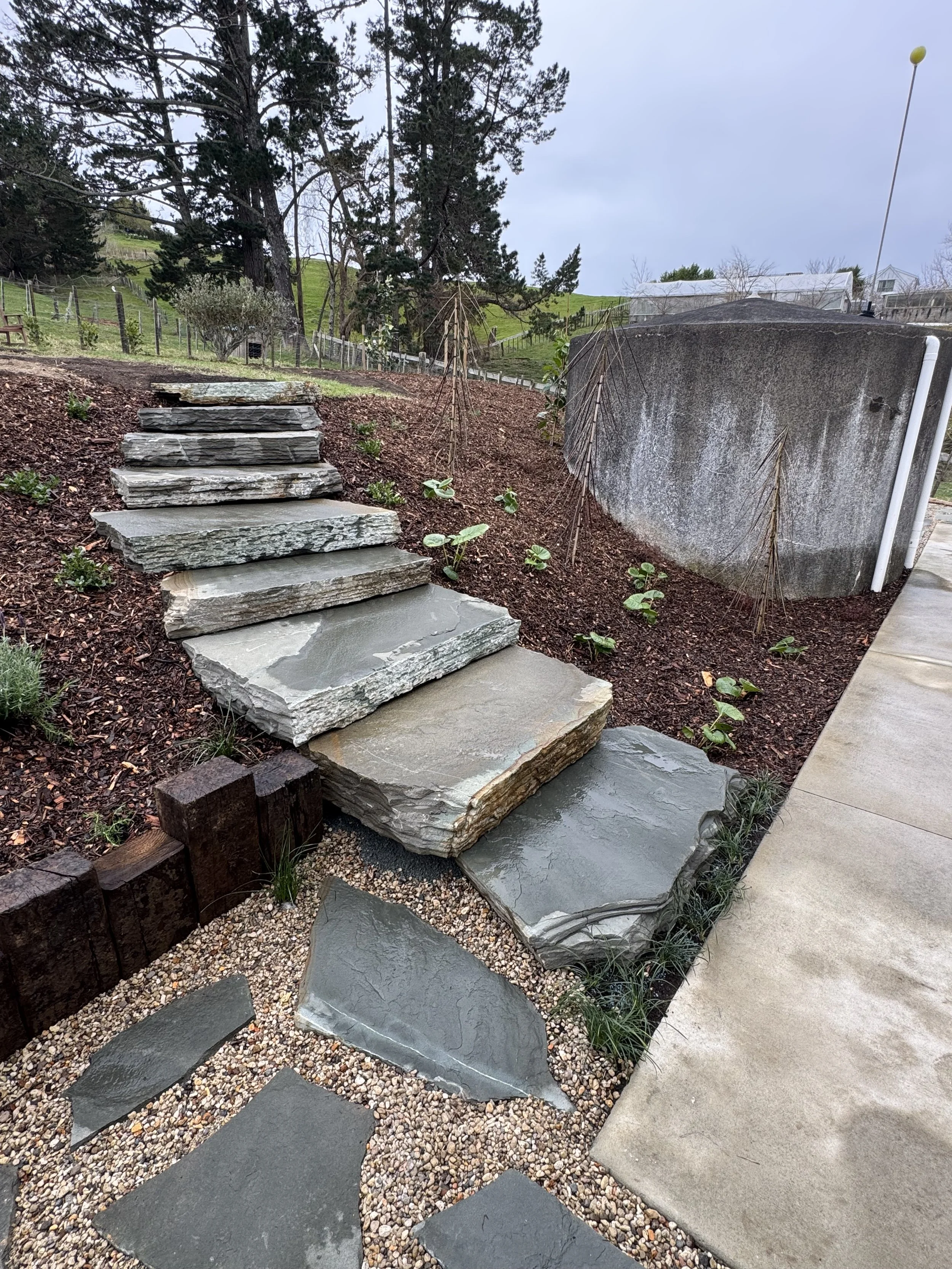 Tucked into the rolling countryside of Stillwater, Auckland, this project blends natural materials and structured form to create a timeless outdoor retreat. The design features Paradise Stone staircases and crazy paving, offering an organic flow that complements the surrounding rural setting.